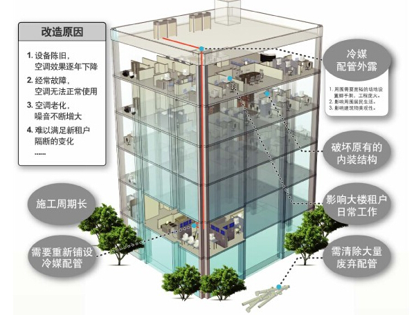 隨著空調使用年限的增加,很多產品運行至今已經接近10年。空調問題開始凸顯,比如故障率頻發、小毛病不斷、壓縮機燒機率增高、維保費用逐漸增加、耗能嚴重、空調負荷無法滿足人們需要等,很多用戶亟待進行改造。